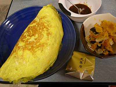 ・ぱっつんぱっつんのオムレツ (キャベツ、挽肉、タマネギ、椎茸。ケチャップじゃなくて、お好み焼きっぽいソースで)
